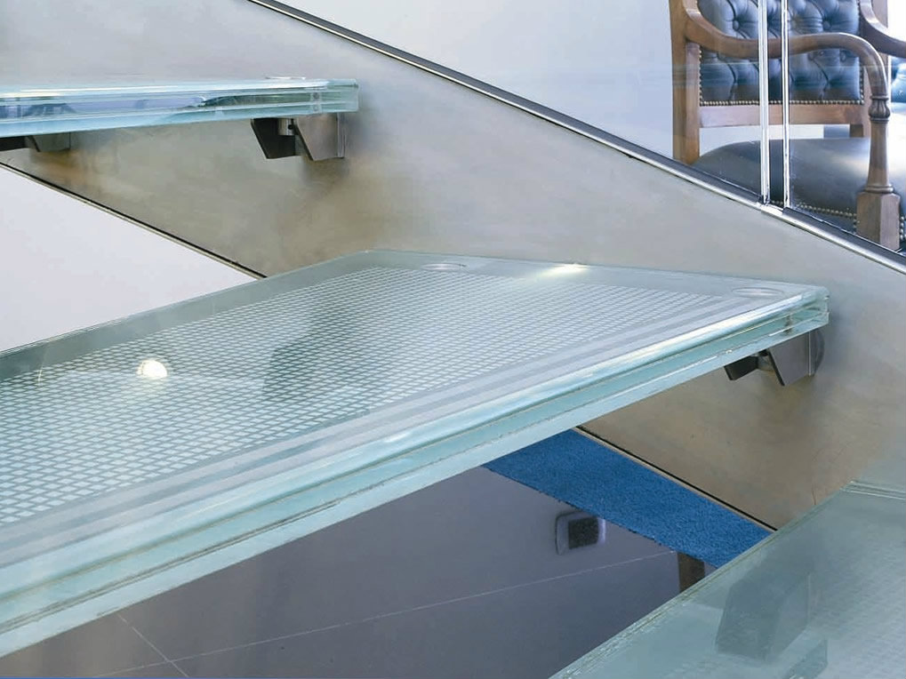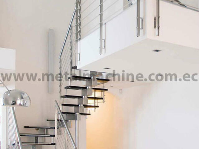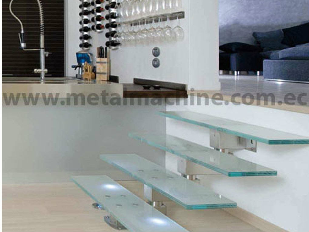 La tendencia en la actualidad nos ha llevado a combinar el acero inoxidable con el vidrio templado y laminado los peldaños son ensamblados con 3 vidrios templados de 12 mm de espesor y juntados mediante una lámina que permite al vidrio tener una adherencia en caso de que exista alguna ruptura previniendo accidentes.